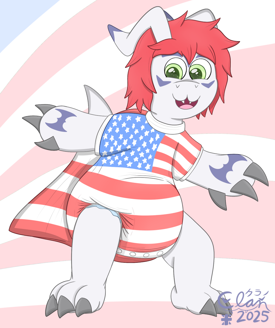 A flag cape onesie on a very happy Gomamon for a very Happy Flag Day!