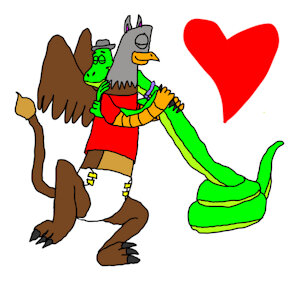 But the children weren't the only ones Slither Scale had taught. Among them was a teenage gryphon wearing a red shirt and a diaper. He has brown feathers and fur, and gray feathers on his head, with an orange beak and talons. He just sat quietly in his seat, and would listen to Slither Scale's lectures. And when school was out, the gryphon would follow Slither Scale to his house, for you see, Slither Scale became the gryphon's guardian when the gryphon was a chick. Oh, and the gryphon's name was Feathers, a name Slither Scale gave to him.