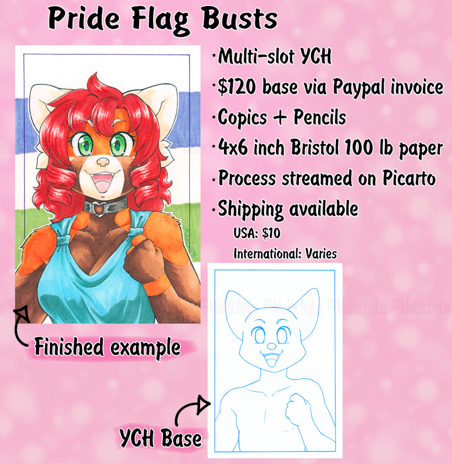 I am now accepting limited orders for a traditional media, Copic colored YCH! Following up with last week's Pride YCH, this time we turn peppy and prideful with your character in front of a flag of your choice.