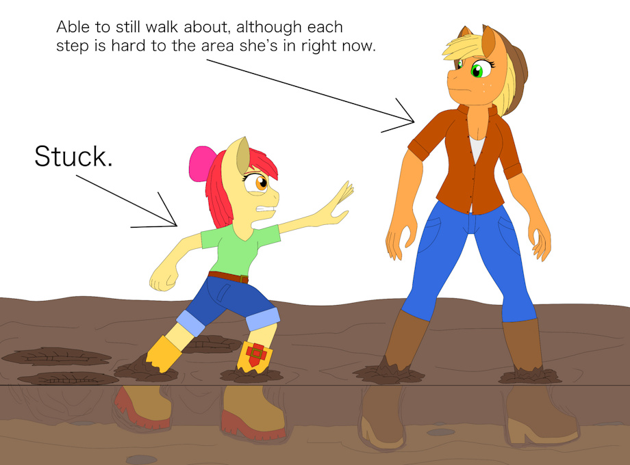 Farms are like this. Not everyday, But on plenty of days. Applejack can find it harder to walk when it happens, but is able to get by just fine. Applebloom is not as grown as her yet, And will need rescuing from how wet the ground is from time to time. Applejack knows how Applebloom feels. To try and keep up with an older sibling, But to fail spectacularly due to being younger. Applejack was as young as Applebloom, So she knows what’s that’s like. Even though I don’t know what they would be saying to each other in times like this which is why they’re no speech bubbles here.