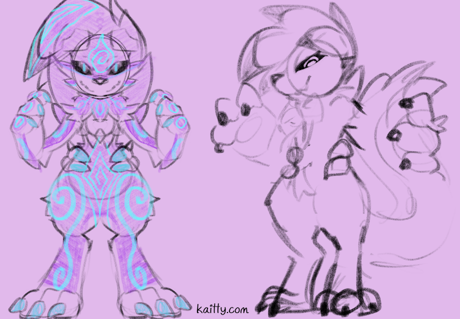 Some months ago, I was coming up with a design for a new avatar base I wanted to texture in VRChat. The base avatar was a (Vulper) canine and I've always wanted a Lycanroc character. However, this was just the first concept. Her colors and markings ended up very different: mauve fur with dark purple markings which are shared with her alternate form..