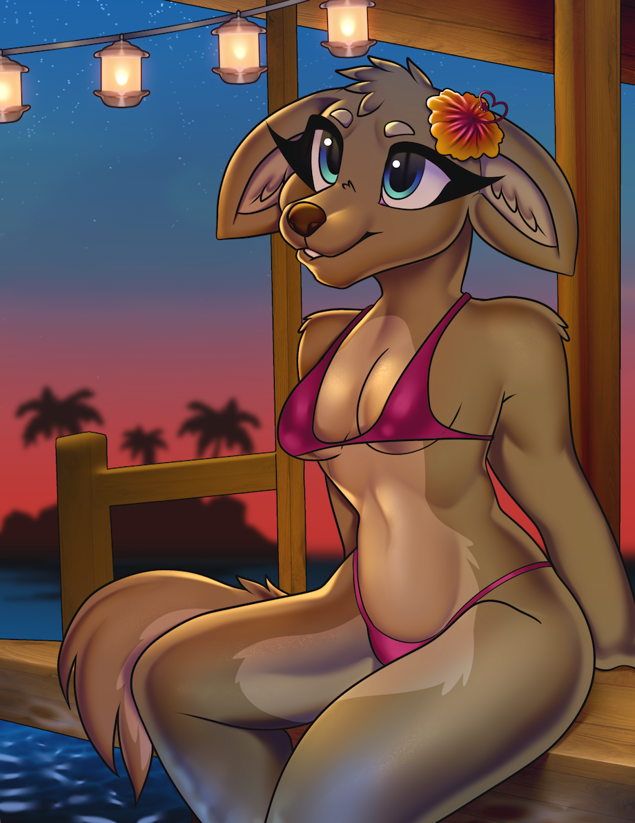 A wolf girl is watching the sunset while relaxing on the dock. 💕☀️