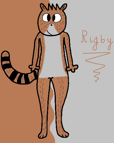 rigby in my style. i was inspired to draw this, since ive been watching regular show on netflix most recently; hes my favorite character out of the show! i like how he wants to act tough, but mordecai mostly gets his way due to being more buff, and i think rigbys kinda cute sometimes tbh haha