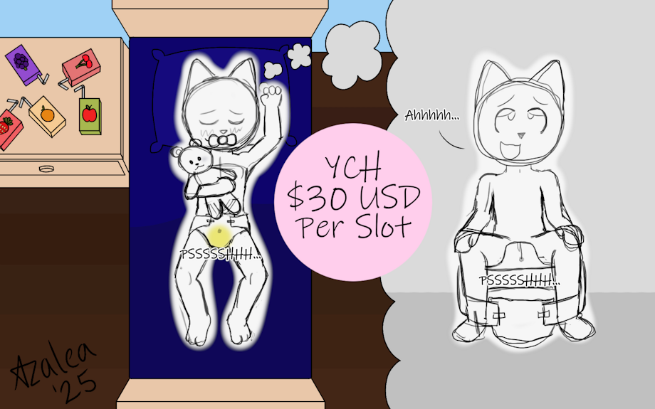 A YCH featuring a diapered fur who drank one too many juice boxes right before bed, and decides to trust the training potty in their dreams. Thankfully they put on a diaper before going to bed.