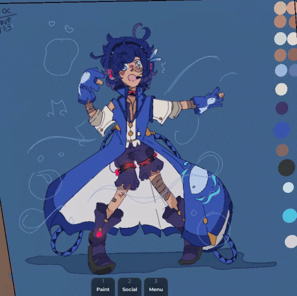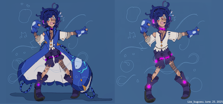 Redrew my vocaloid character, I felt giving a bit of a redesign, this art of him was drawn in the Roblox game Realistic spray paint & donate. I decided to stay with more blue, and I switch the purple color in his hair to blue, with purple tips instead. (also gave him heterochromia because yes, and glowing parts that change colour, along with an oversized coat uu)~
