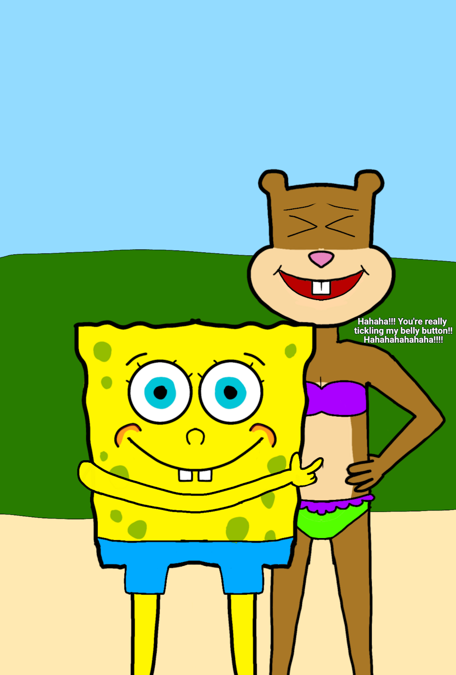 SpongeBob and Sandy having fun at the beach out of Bikini Bottom and SpongeBob begins tickling Sandy's belly button.