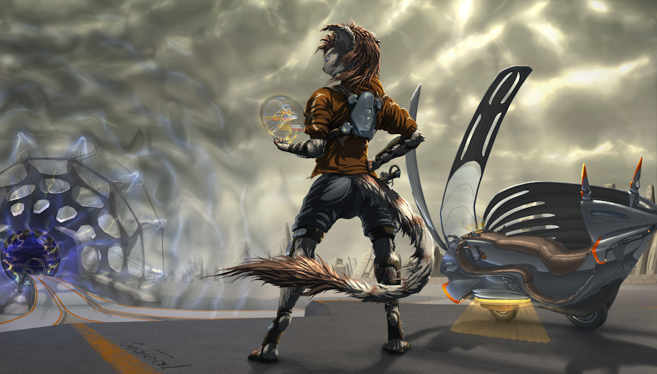 (As a side note, his bike is a two wheeler but enhanced with pseudomatter projectors on each side, giving it exceptional maneuvering/stabilizing capabilities and even limited hovering possibility.)