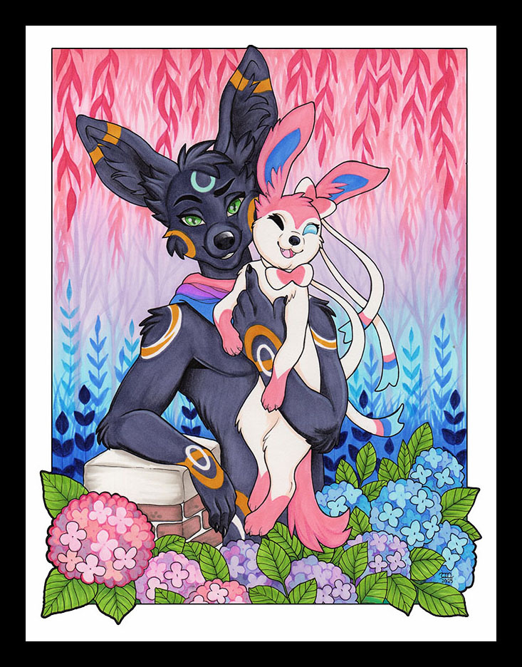 As for the exact content, why umbreon Rorick? Well I wanted a sylveon compan-eon (I'll see myself out now...), as sylveon is considered a symbol of the trans community. While I'm not trans myself, I fully support those in the community. With that, I figured having my pokesona feature would be apt, especially since umbreon is also an eeveelution. All this is paired with a bi-pride flag elements and some bi-drangeas (*Brik'd™* I'll stop now, I promise!) for my particular "place" in the community. You can thank LuthienNightwolf for most of the fine details, I just picked out the characters and let her go at it from there.