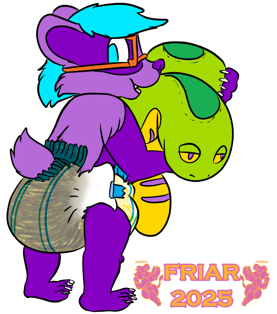 Illustration of Everett the wet and messy diapered badger snuggling his freshly laundered snake plushie while smiling at the viewer.