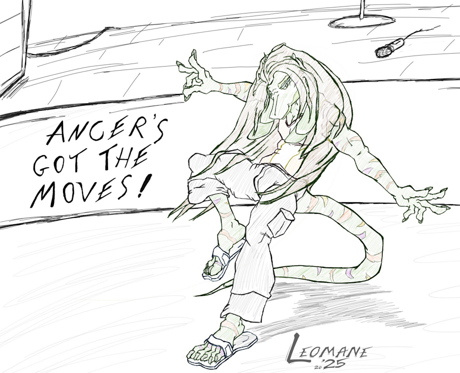 Walking down the crowded tourist street you come across one of the many outdoor stages and your eye is drawn to the knee length silky flowing chocolate brown hair that is swaying and grooving as the yellow greenish reptile moves and bobs to the ambient music off in the distance. Seems the agile tall twinks ears pick it up with zero issue and seems he doesn't mind the ogling, with a smirk and a stare back Ancer strikes a pose spinning to show off his bod and beckon you closer...