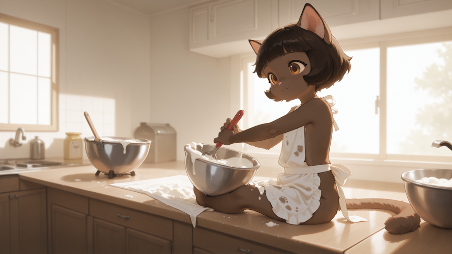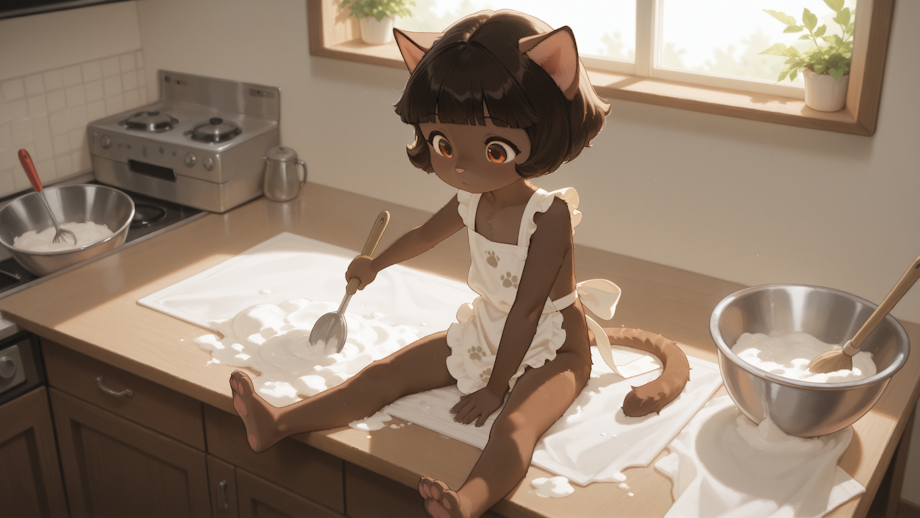 Prompt: Ivy Pepper, solo, cat girl, young, cub, toddler, brown fur, single tone fur, located in kitchen, naked, , sitting on table, mixing dough in mixing bowl, flour prints on fur,