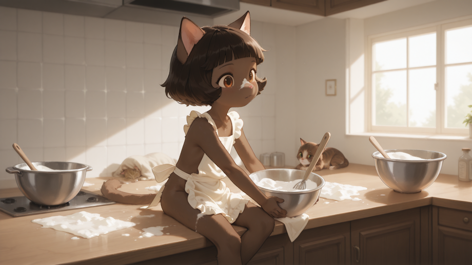 Prompt: Ivy Pepper, solo, cat girl, young, cub, toddler, brown fur, single tone fur, located in kitchen, naked, , sitting on table, mixing dough in mixing bowl, flour prints on fur,