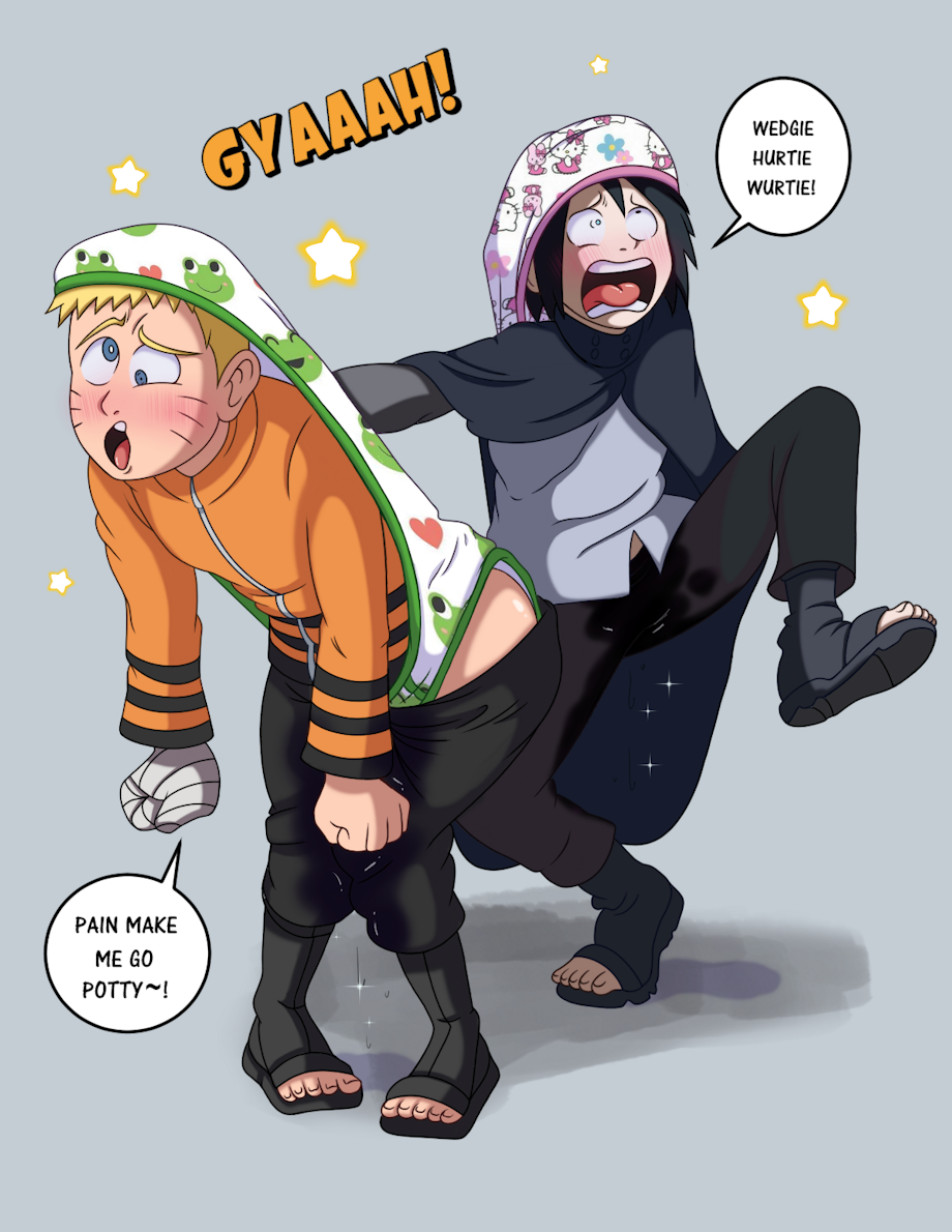 “WEDGIEEEEEEEEEEEEEEEK~!” Naruto and Sasuke screamed aloud in unison, wiggling their butts as the front of their pants started to soak through with simultaneous bladder failures.