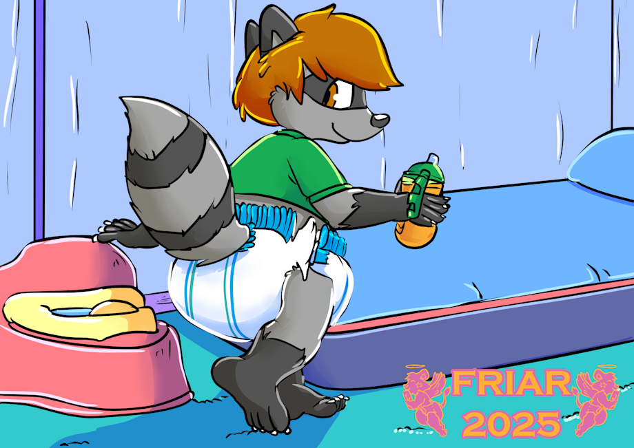 Illustration of Tylahn the wet and messy diapered raccoon walking past a training potty in Everett's bedroom while carrying a sippie cup full of orange juice.