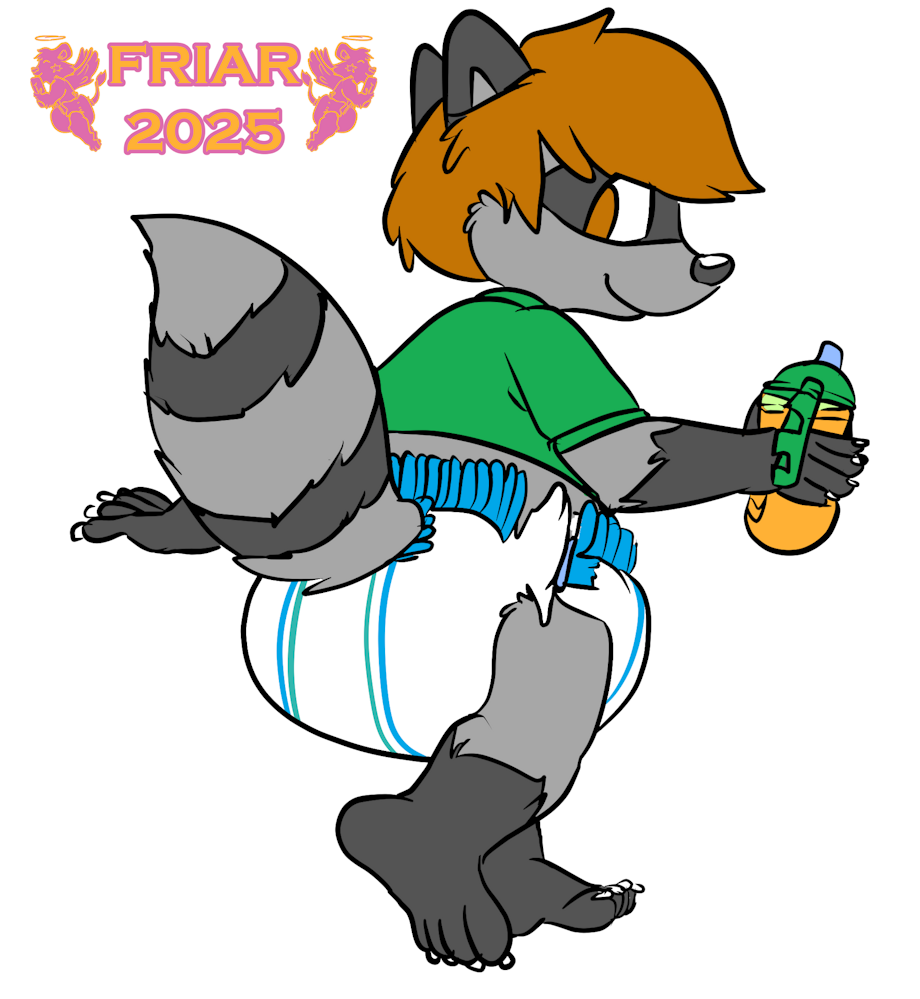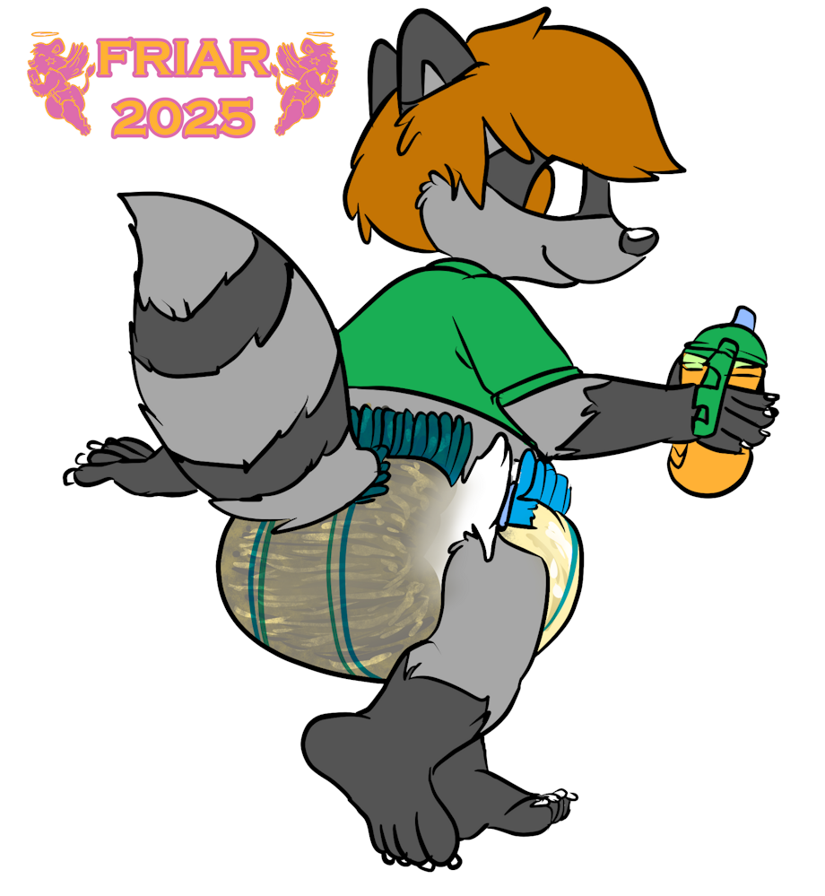 Illustration of Tylahn the wet and messy diapered raccoon walking past a training potty in Everett's bedroom while carrying a sippie cup full of orange juice.