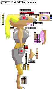 This is a crosspost of https://www.furaffinity.net/view/61446852/ and also a version of https://inkbunny.net/s/3653736 with the palettes added next to where they are used. I also added a shot of the area of her back that is covered with scars, and also often covered in clothing. Although the golden under layer of her outfit does leave those exposed. It was in the wee hours of the morning on July 2nd I went to catalog the colors used in the pixel art & arrange them in neat little boxes.