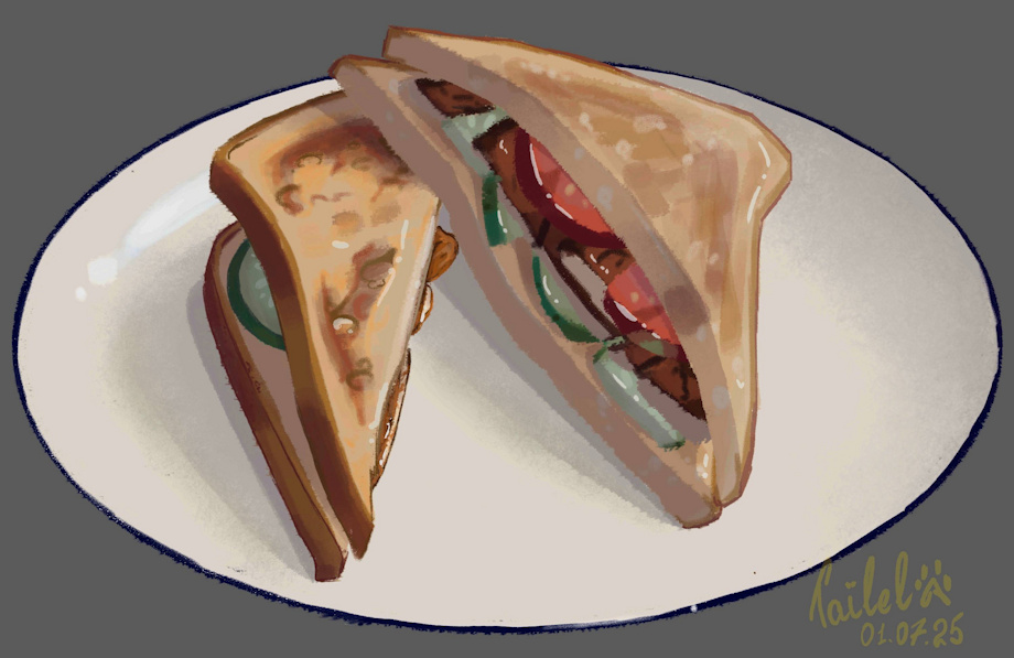 On a sturdy ceramic plate rests the prize of a hungry wanderer: a toasted sandwich made from bread kissed with goldenroot butter, crisped to perfection over open flame.