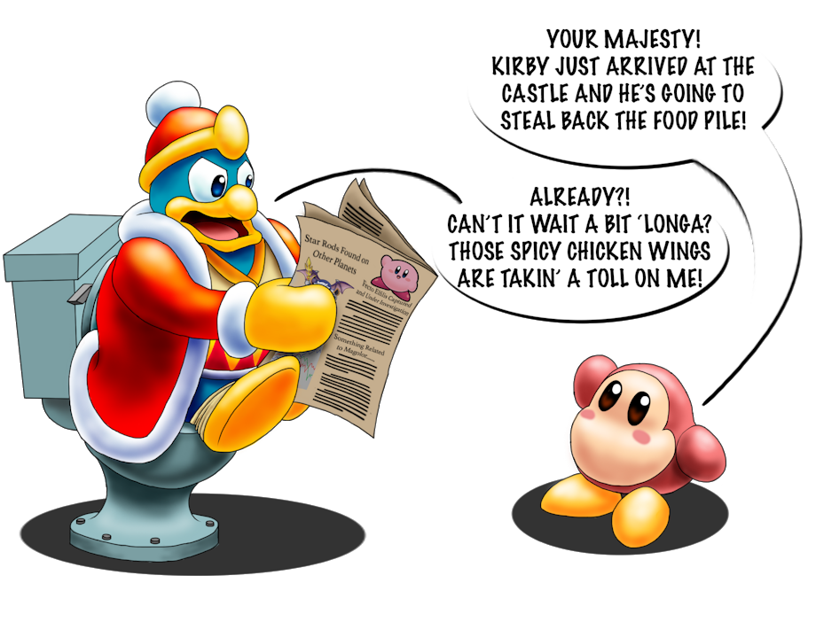 This drawing is based on a request by HarmonyBunny(requests are currently closed) who wanted a toilet pic of King Dedede from the Kirby series being interrupted while on the throne. Can the guy ever catch a break?