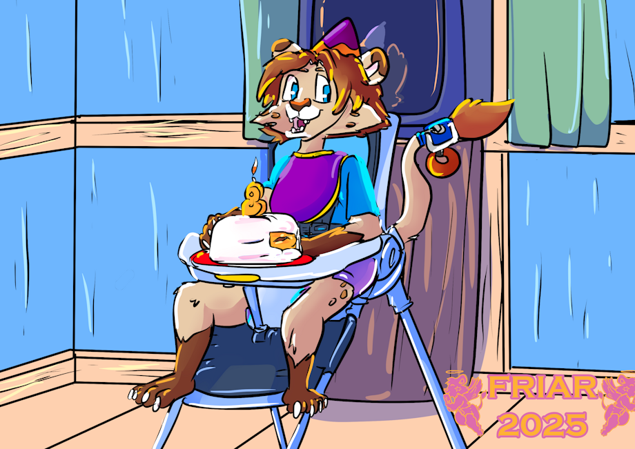 Illustration of Toffee the wet and messy diapered lion seated in a high chair having a diaper shaped cake for his eighth birthday in the treehouse.