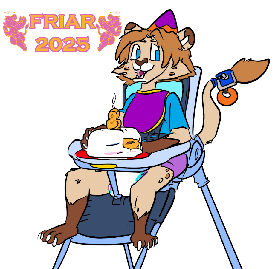 Illustration of Toffee the wet and messy diapered lion seated in a high chair having a diaper shaped cake for his eighth birthday in the treehouse.