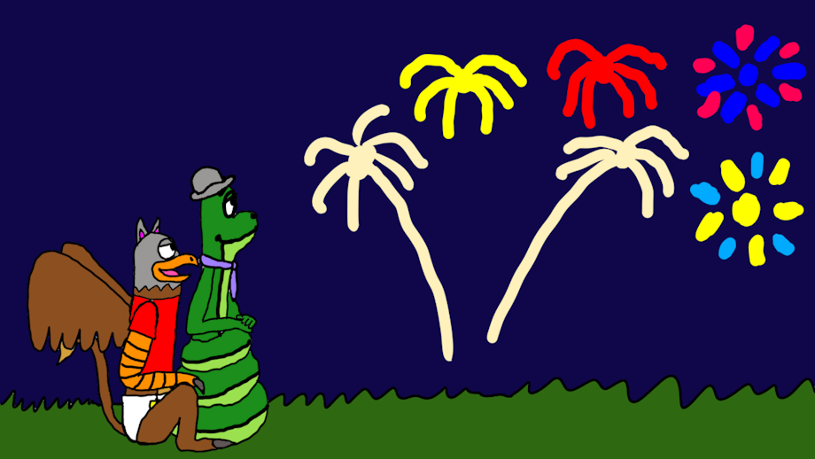 Feathers and his caretaker Slither Scale sat in the grass, watching fireworks explode in the night sky, with colors and whistles.