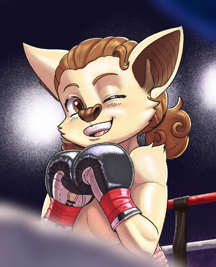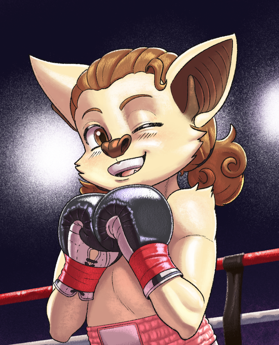 A collab of sorts based on a sketch made by https://www.pixiv.net/en/users/236844 of a younger version of Bella during a fight of hers. Well before her masochism kink was awakened, she was able to maintain a good record in the ring.
