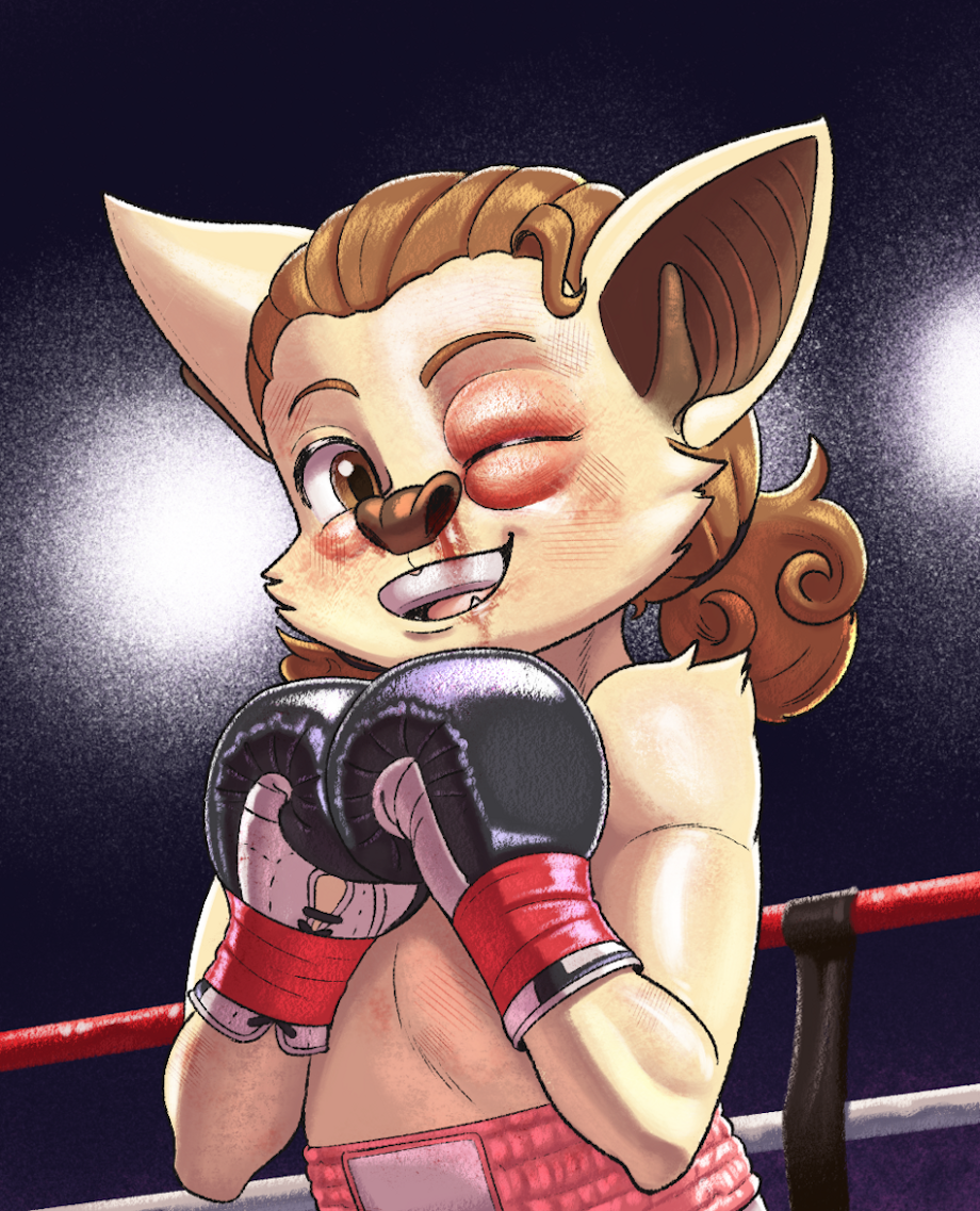A collab of sorts based on a sketch made by https://www.pixiv.net/en/users/236844 of a younger version of Bella during a fight of hers. Well before her masochism kink was awakened, she was able to maintain a good record in the ring.