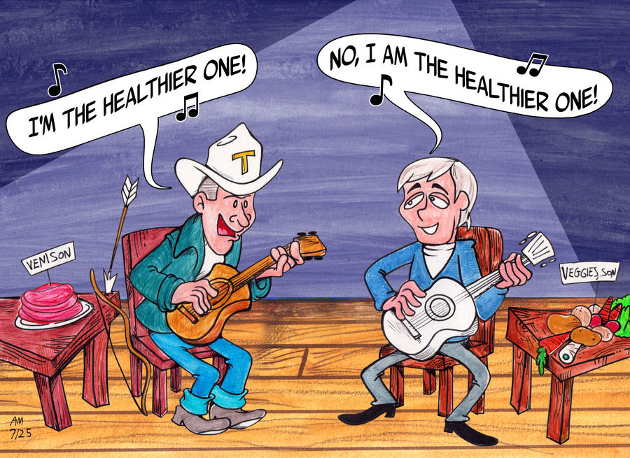 I saw a recent YouTube video where Ted Nugent advocates eating meat and hunting deer to be healthy, in contrast to vegetarian Paul McCartney.