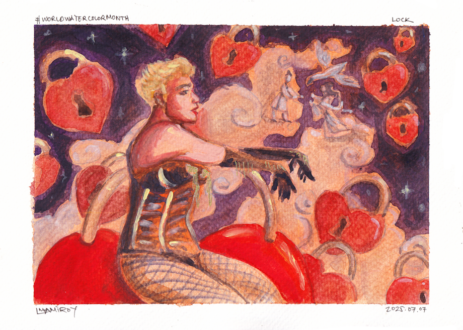 Anyway, here's Madonna, inspired by her "Open Your Heart" video, floating atop heart locks. Observing those ancient Chinese star-crossed lovers and a swan, on the Summer Triangle.