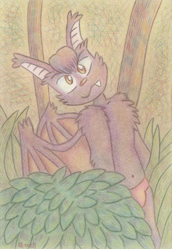 I draw my bat boy character Kuraresu with green forest background and I draw this art in 2012. in that time I'm stick to using cross hatching effect much and the color have much depth than other arts, I feel the positions on character and green leaves become good.