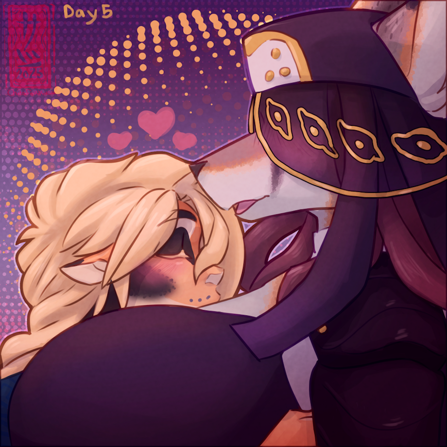 Back in February I took part of a week long challenge called OC Kiss week were you draw non-cannon characters... well, kissing =p for the week of valentines, if you're curious here is the OC Kiss week 25 info! For this challenge I chose my OC's Dunn and Kit for the first 4 prompts and Dunn and Tecu from Pathfinder for the last 3 prompts. As for why I'm posting this now, to make a long story short, I made pre sketches for each prompt a week before and was determined to get 4 out of 7 done during the initial week. Which I had succeeded in doing, however since I liked all the pre-sketches of the remaining prompts, I wanted to finish those too, which took about 3 months later to complete. Even though it took a while to finish I had a lot of fun for each prompt and learned a lot!