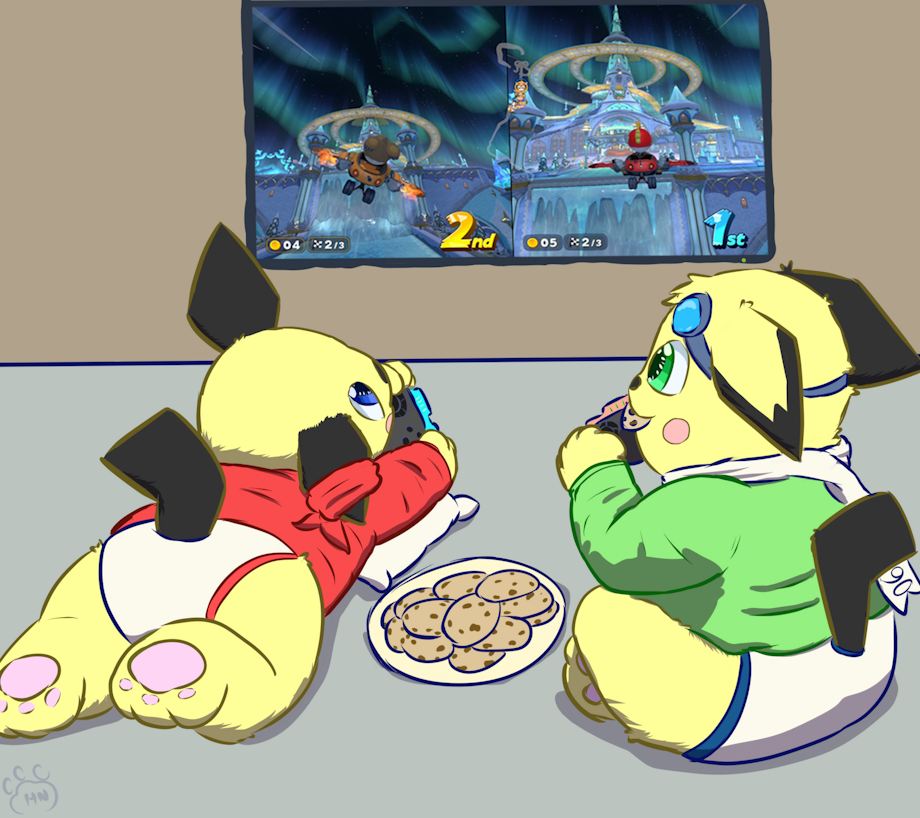 Bolty & Sparks playing Mario Kart World on Switch 2 while eating some chocolate chip cookies