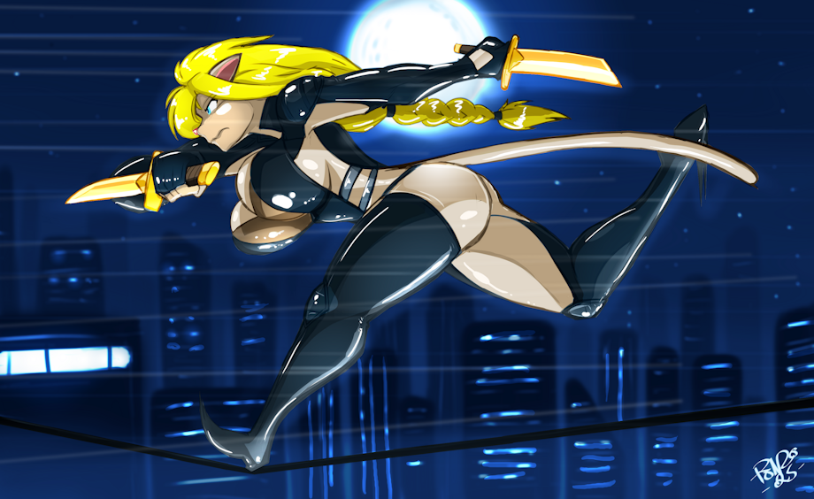 Sho had a theme and it was Running, so that was perfect to return to my anthro Champagne ninja running across a line between buildings. This came out fantastic, the background is that chefs kiss extra too. Sho was listening to the cyberpunk soundtrack, ill get around to playing that someday X3
