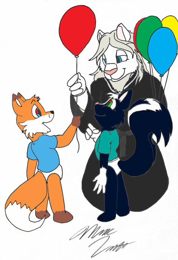 Me and my friend Kenny Kitsune getting some balloons from my mate. Drawn by Marc Leonhardt colored by me
