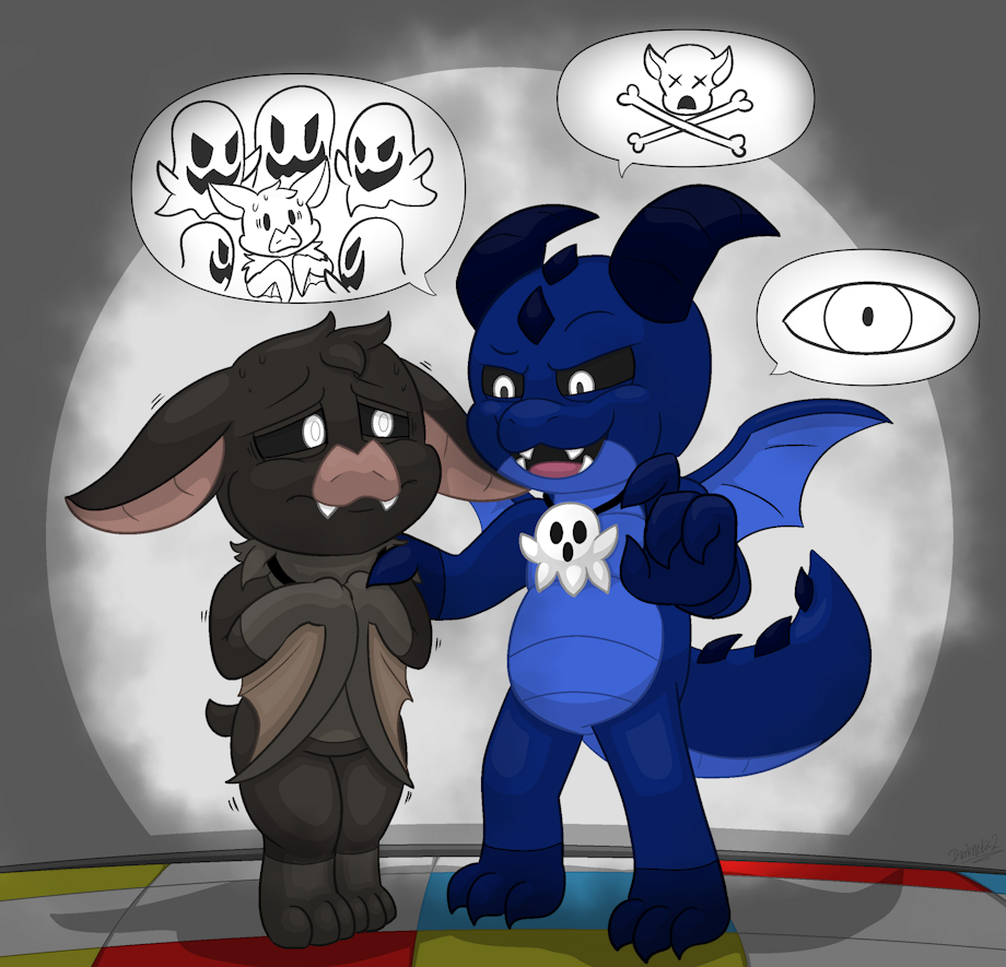 [Story] Draco Ghostly loves scaring other critters with scary "ghost stories" and gets a "kick" out of their fear. This time, he heard gossips from Rabie Baby, that the nobody "Gloomy" would be a perfect victim and well, he took his chance to scare and terrify the lil batsy... ___________________________________________________ [Artfight-Revenge] on @SolarTheSkywing