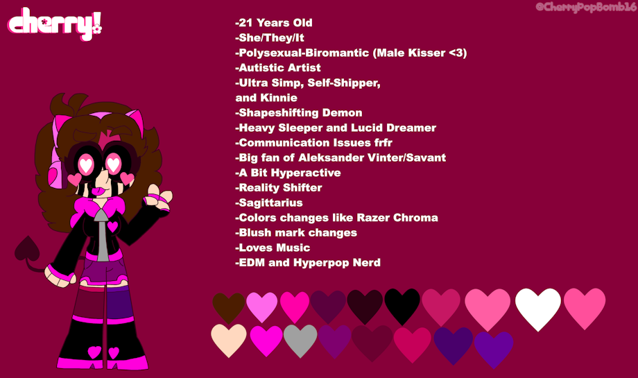 Likes: EDM, VOCALOID/UTAU and Hyperpop, Aleksander Vinter/Savant (Idolizes), Cherry Blossom, Pink and Purple Colors, Horror, EXEs and Oddities, Horrorbrews, Her magical abilities, Her three partners, Sonic the Hedgehog (Franchise), Her siblings (looks after), Hoodies, Cats, Japanese Culture
