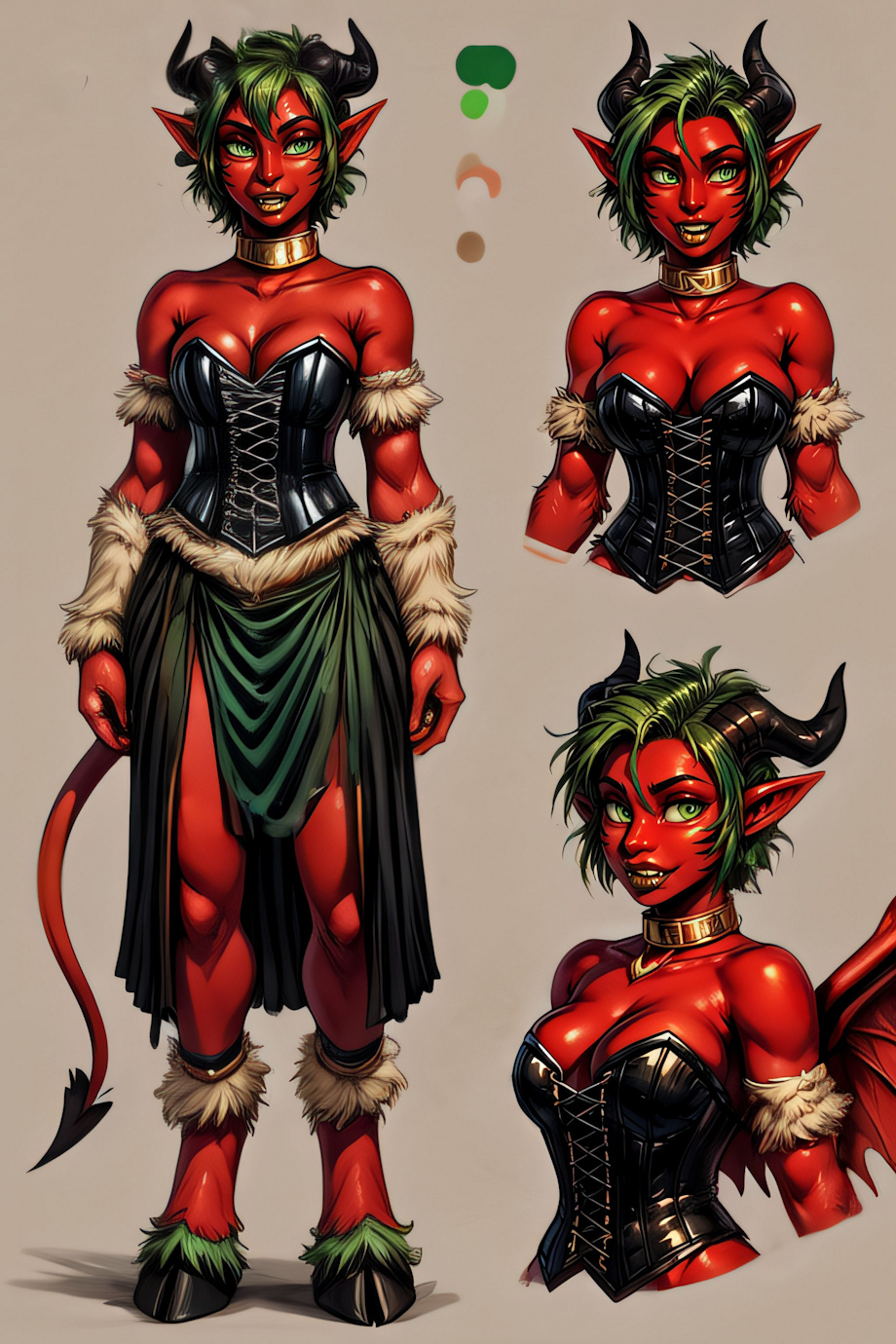 Red Skin with Black Stripes, Athletic build, Thick Lips, Hooves, Spaded Tail, Red Wings that appear from nowhere, black curved horns, white fur on wrists, yellow clawed fingers, and pointed ears.