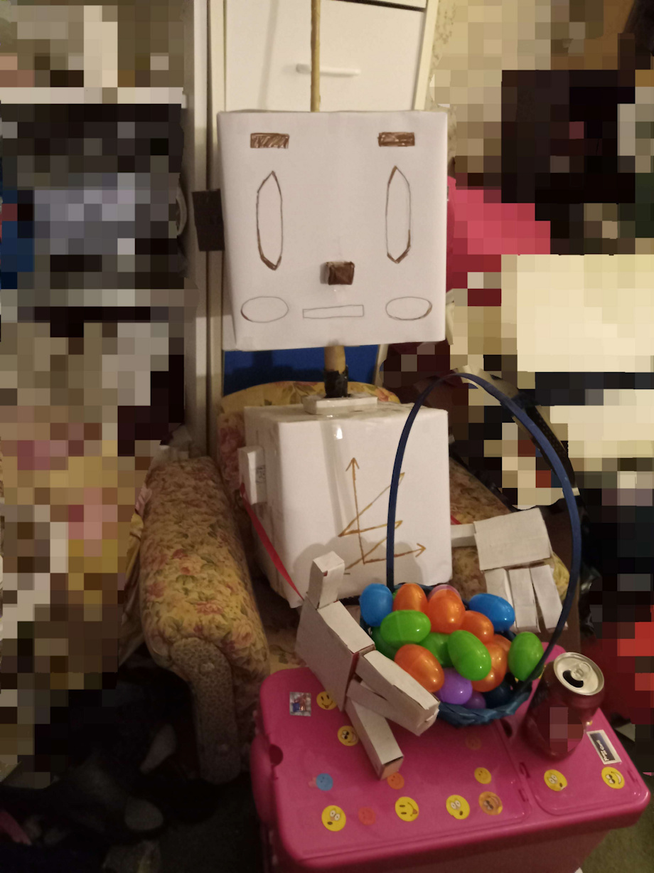 It feels weird posting this before some kind of introduction to the character but that'll be posted soon along with other sketches we have of him. Made with cardboard scraps including paper towel and foil rolls, lots of paper including tissue paper to stuff the bottom of it, giftwrap tape and duct tape, and ribbon for the arms and legs.
