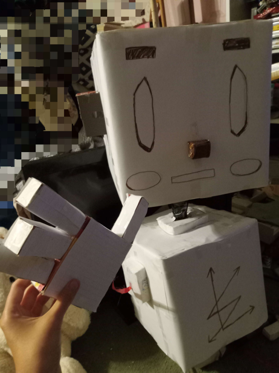 It feels weird posting this before some kind of introduction to the character but that'll be posted soon along with other sketches we have of him. Made with cardboard scraps including paper towel and foil rolls, lots of paper including tissue paper to stuff the bottom of it, giftwrap tape and duct tape, and ribbon for the arms and legs.