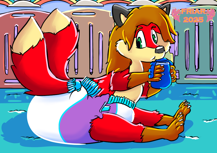 Illustration of Ozzy the wet and messy diapered two tailed fox seated in a playpen while enjoying his sippie cup.