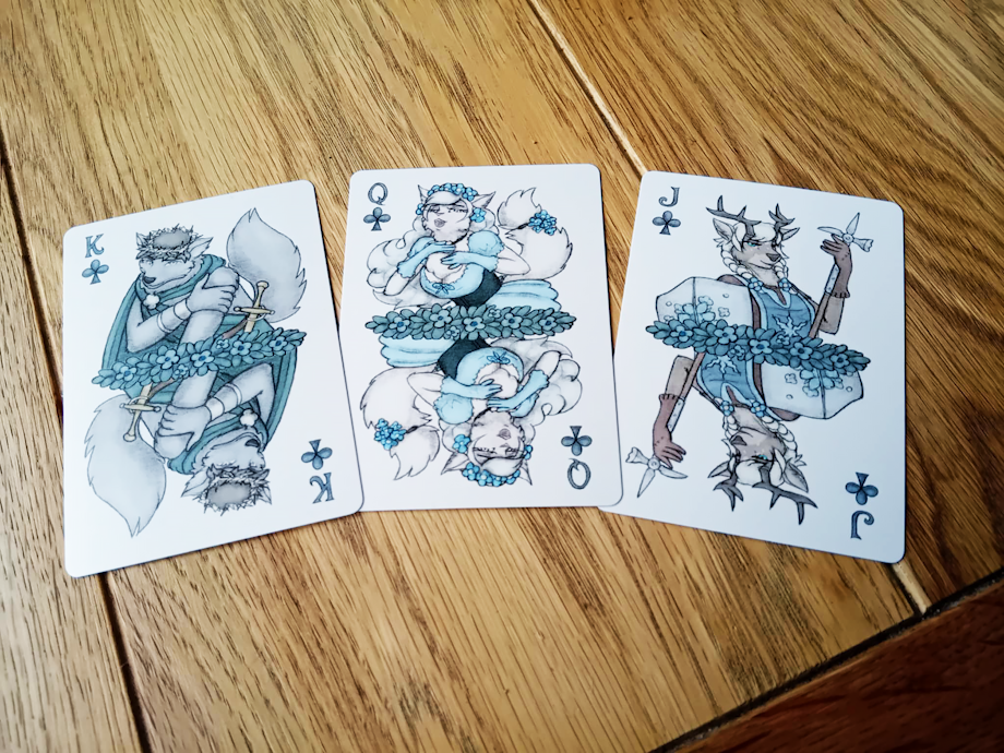 The playing cards feature mighty and solemn kings; delicate and seductive queens; and lively tomboy jacks. There are of course cute jokers too. All suits, ranks, and flowers were drawn by hand, then polished digitally.