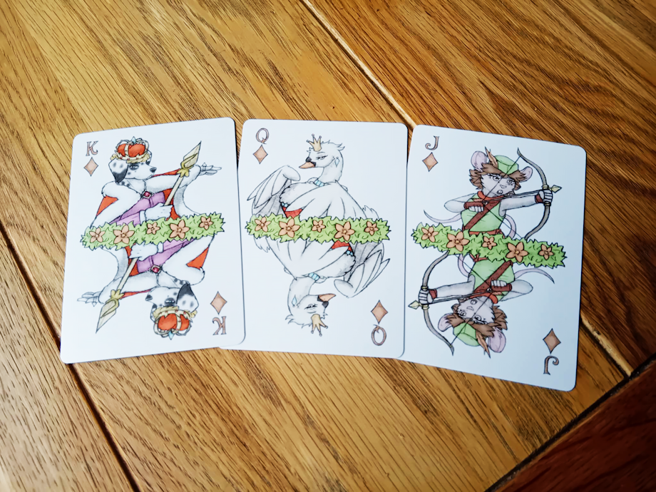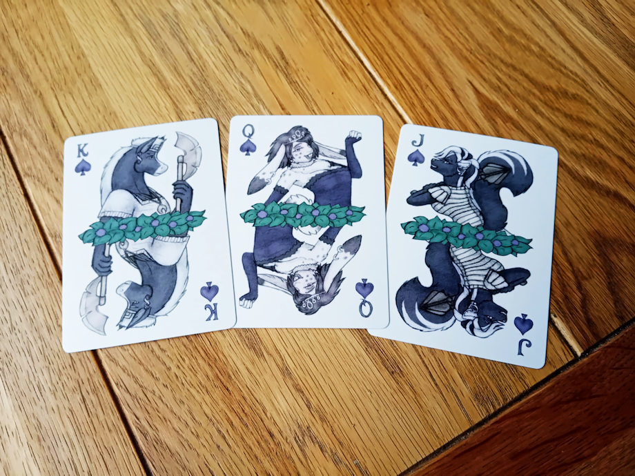 The playing cards feature mighty and solemn kings; delicate and seductive queens; and lively tomboy jacks. There are of course cute jokers too. All suits, ranks, and flowers were drawn by hand, then polished digitally.