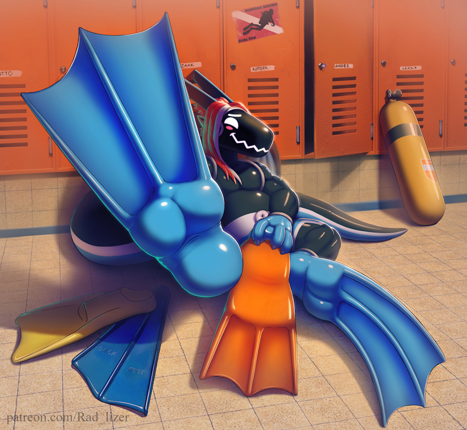 "I can explain, im just inspecting them!.. Actually, it's exactly what it looks like." Done for Izaak of his protodiver, a scubaphile with a fin fetish, maybe you'd like to join him? His own large fins could use an inspection~.