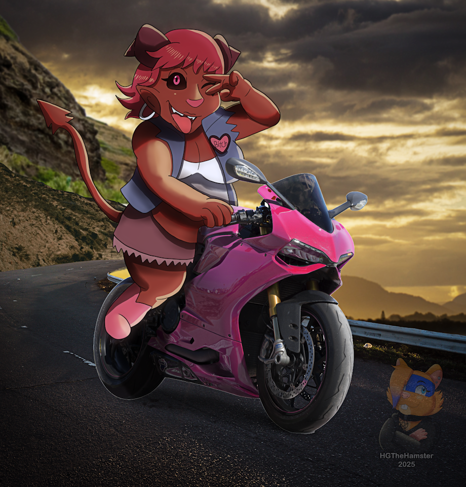 Done for https://x.com/croxovergoddess for Art Fight! This was a character who had been in my bookmarks who I really wanted to draw for a while. And we all know me for a while and that I really like drawing demons lol. I saw in the description of this character that they were heavily into motorcycle stuff so I tried photobashing that into this drawing. Originally I wanted them to be next to the bike crossing their arms, but when I tried drawing it did not turn out how I wanted. So I instead just drew them riding on the bike instead.