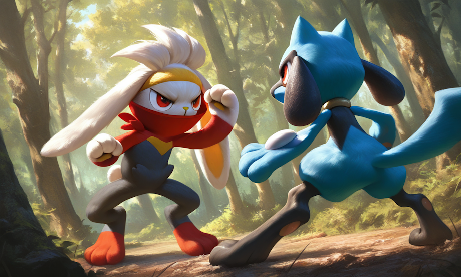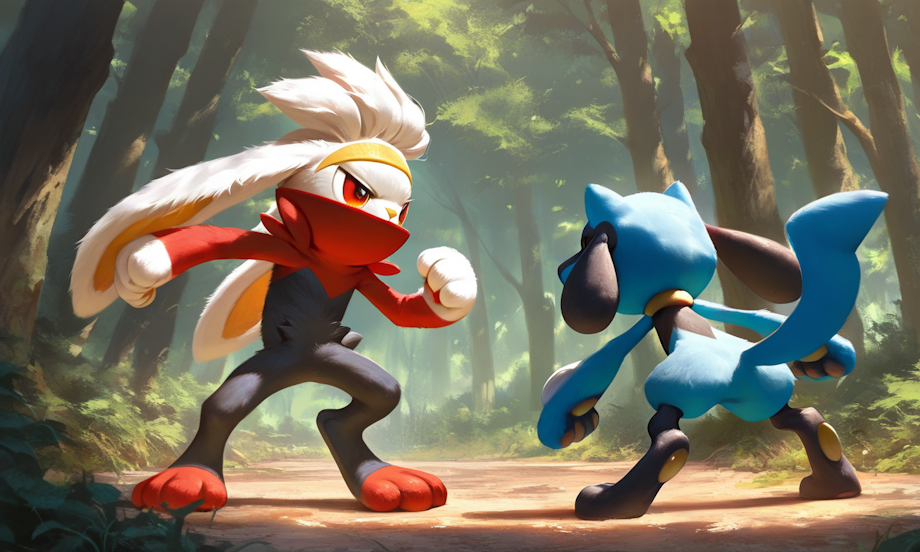 Prompt: Riolu, raboot, outside, forest, no humans, best quality, excellent detail, animal legs, animal hands, Hype4realistic, detailed face, standing, fighting,