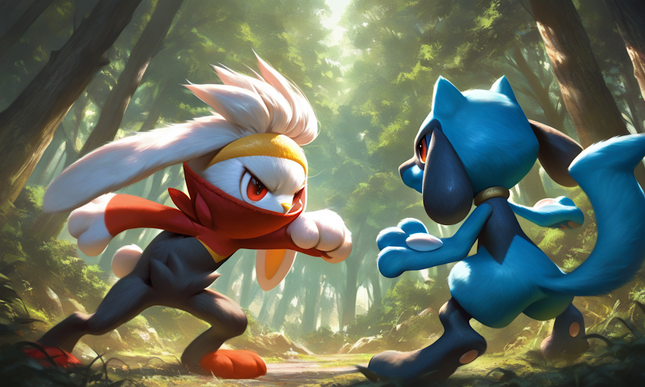 Prompt: Riolu, raboot, outside, forest, no humans, best quality, excellent detail, animal legs, animal hands, Hype4realistic, detailed face, standing, fighting,