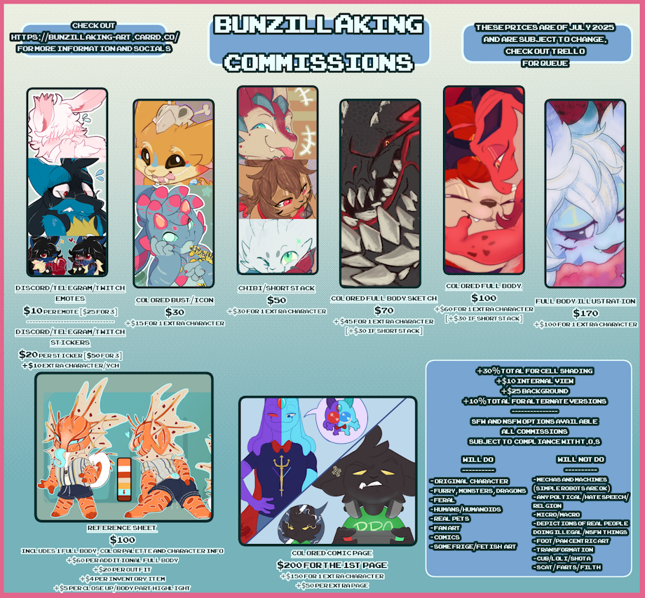 LONG overdue but I put together a little commission sheet so you can see my prices at a glance. All the socials, smaller details and TOS are on bunzillaking-art.carrd.co but this will give you a pretty good idea of pricing!