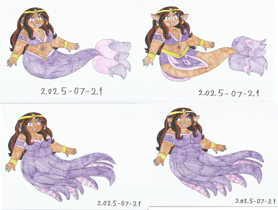Anyway. Here are concept arts of the different designs of Zayna Wazim in her mermaid forms. I was thinking about she can transform herself because she is of course a witch. I can imagine her transform herself into a mermaid in order to gather some ingredients for her magic spells and/or finding magical treasure jewel things underwater.
