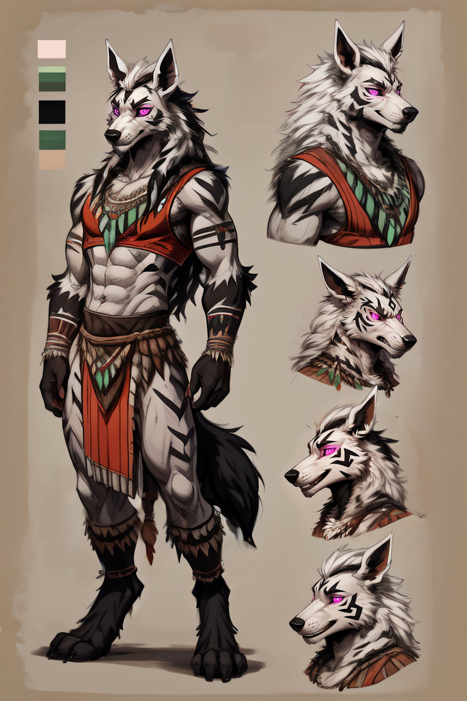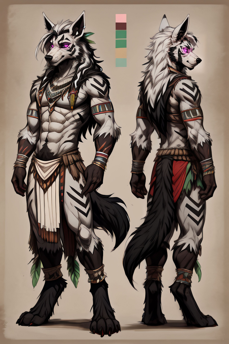 masterpiece, best quality <lora:(1) Furtastic Detailer:1> <lora:(1) Character Design Concept:0.6> (CharacterSheet:1), (multiple views, full body, upper body, reference sheet:1) (tribal outfit:1.4), BREAK <ch4kr4m> (male:1.3) A (mightyena:1.4) with (white furry forearms:1.3) and he has (long hair:1.4) (white hair:1.3) (glowing eyes:1.2) (white fur:1.2), and (pink eyes with black pupils:1.4) (athletic:1.4) (toned:1.4) (green sclera:1.4) (black highlights:1.5) (black tribal markings:1.5) (digitigrade:1.2) legs, and (brown belly:1.4) (muscular:1.5), (clothes:2) Negative prompt: bloodshot eyes, arms behind back, hands behind back, blurry, blurry background, bad anatomy, bad hands, three hands, three legs, bad arms, missing legs, missing arms, poorly drawn face, bad face, fused face, cloned face, worst face, three crus, extra crus, fused crus, worst feet, three feet, fused feet, fused thigh, three thigh, fused thigh, extra thigh, worst thigh, missing fingers, extra fingers, ugly fingers, long fingers, horn, realistic photo, extra eyes, huge eyes, 2girl, amputation, disconnected limbs, worst quality, normal quality, low quality, low res, blurry, text, watermark, logo, banner, extra digits, cropped, jpeg artifacts, signature, username, error, sketch ,duplicate, ugly, monochrome, horror, geometry, mutation, disgusting, jpeg artifacts, bad quality, jpg artifacts,badhandv4, easynegative boring_e621_v4, (nipples, nude, nudity:2) (erect nipples:2) (topless:2) Steps: 35, Sampler: Euler a, CFG scale: 7, Seed: 681031386, Size: 512x768, Model hash: 8e2f4f1346, Model: yiffymix_v44, VAE hash: 24e650297c, VAE: furception_vae_1-0.safetensors, Denoising strength: 0.1, CFG Rescale: 0.7, ADetailer model: person_yolov8s-seg.pt, ADetailer confidence: 0.3, ADetailer dilate erode: 4, ADetailer mask blur: 4, ADetailer denoising strength: 0.4, ADetailer inpaint only masked: True, ADetailer inpaint padding: 32, ADetailer model 2nd: face_yolov8s.pt, ADetailer confidence 2nd: 0.3, ADetailer dilate erode 2nd: 4, ADetailer mask blur 2nd: 4, ADetailer denoising strength 2nd: 0.4, ADetailer inpaint only masked 2nd: True, ADetailer inpaint padding 2nd: 32, ADetailer version: 25.3.0, Hires upscale: 1.5, Hires steps: 20, Hires upscaler: 4xUltrasharp_4xUltrasharpV10.pth, Lora hashes: "(1) Furtastic Detailer: 2e94914f676c, (1) Character Design Concept: 6f65857a23ad", TI hashes: "badhandv4: 5e40d722fc3d, easynegative: c74b4e810b03, boring_e621_v4: f9b806505bc2", Version: v1.6.0 |