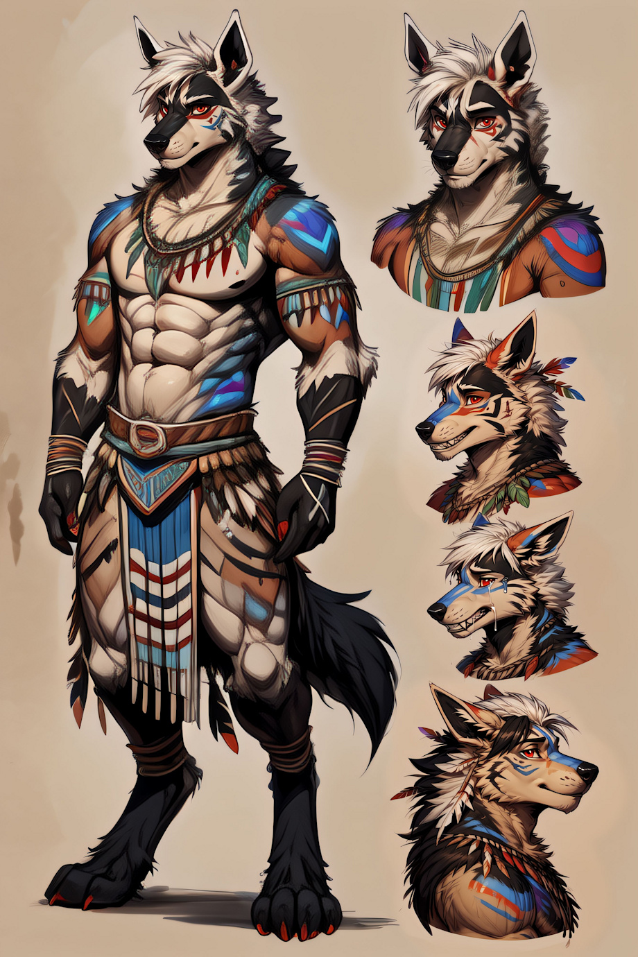masterpiece, best quality <lora:(1) Furtastic Detailer:1> (colorful body paint, tribal outfit:1.4) <lora:(1) Character Design Concept:0.6> (CharacterSheet:1), (multiple views, full body, upper body, reference sheet:1),, BREAK <sp4rk> A (mightyena:1.3) (male:1.2) (muscular:2) (blue markings:1.3) (tribal markings:1.3) with (snout:1.3). He has (short hair:1.3) (white hair:1.3) (short bangs:1.4) (tan fur:1.5) (athletic:1.4) (red eyes with black pupils:1.5) and (digitigrade:1.5) legs, and (white belly:1.4) (thick neck:1.4) (veins:1.4), (clothes:2) Negative prompt: bloodshot eyes, arms behind back, hands behind back, blurry, blurry background, bad anatomy, bad hands, three hands, three legs, bad arms, missing legs, missing arms, poorly drawn face, bad face, fused face, cloned face, worst face, three crus, extra crus, fused crus, worst feet, three feet, fused feet, fused thigh, three thigh, fused thigh, extra thigh, worst thigh, missing fingers, extra fingers, ugly fingers, long fingers, horn, realistic photo, extra eyes, huge eyes, 2girl, amputation, disconnected limbs, worst quality, normal quality, low quality, low res, blurry, text, watermark, logo, banner, extra digits, cropped, jpeg artifacts, signature, username, error, sketch ,duplicate, ugly, monochrome, horror, geometry, mutation, disgusting, jpeg artifacts, bad quality, jpg artifacts,badhandv4, easynegative boring_e621_v4, (nipples, nude, nudity:2) (erect nipples:2) (topless:2) Steps: 35, Sampler: Euler a, CFG scale: 7, Seed: 591975170, Size: 512x768, Model hash: 8e2f4f1346, Model: yiffymix_v44, VAE hash: 24e650297c, VAE: furception_vae_1-0.safetensors, Denoising strength: 0, CFG Rescale: 0.7, ADetailer model: person_yolov8s-seg.pt, ADetailer confidence: 0.3, ADetailer dilate erode: 4, ADetailer mask blur: 4, ADetailer denoising strength: 0.4, ADetailer inpaint only masked: True, ADetailer inpaint padding: 32, ADetailer model 2nd: face_yolov8s.pt, ADetailer confidence 2nd: 0.3, ADetailer dilate erode 2nd: 4, ADetailer mask blur 2nd: 4, ADetailer denoising strength 2nd: 0.4, ADetailer inpaint only masked 2nd: True, ADetailer inpaint padding 2nd: 32, ADetailer version: 25.3.0, Hires upscale: 1.5, Hires steps: 20, Hires upscaler: 4xUltrasharp_4xUltrasharpV10.pth, Lora hashes: "(1) Furtastic Detailer: 2e94914f676c, (1) Character Design Concept: 6f65857a23ad", Version: v1.6.0 |